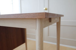 天板はチークの突き板をウレタンオイル塗装で仕上げ、脚はホワイトオークをソープフィニッシュで仕上げています。