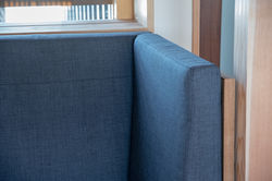 窓枠いっぱいのハイバックのクッションにより囲まれたパーソナルな空間に。再度クッションもハイバックにして横向きでも体を預けられる。